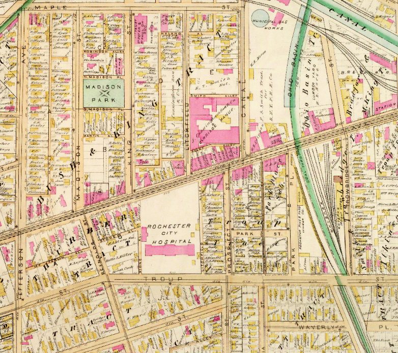 This is a map from 1888, the earliest I can easily find digitally. Madison Park is the green space that was once Mechanics’ Square. The area marked as Rochester City Hospital was initially the Buffalo Road Cemetery, but the graves were moved to Mt Hope in 1859 so the hospital could be built. We can also see that Prospect Street connects Troup Street to West Main (or, at the time, Buffalo Road). The stretch of Prospect is, today, a pedestrian path.
