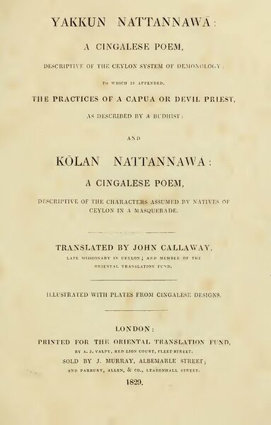 Descriptive of the Ceylon system of Demonology: to which is appended, The practices of a Capua or Devil Priest, as described by a Budhist: and Kolan Nattannawa: A Cingalese Poem, descriptive of the characters assumed by natives of Ceylon in a Masquerade.