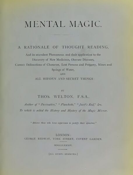 A Rationale of Thought Reading. And its attendant phenomena, and their application to the discovery of new medicines, obscure diseases, correct delineations of character, lost persons and property, mines and springs of water, and all hidden and secret things.