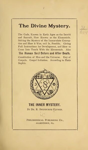 The gods known in early ages as the Incubi and Succubi, now known as the elementals, solving the mystery of the Immaculate Conception and hot it was, and is, possible. Giving full instructions for development, and how to come into touch with the elementals, also the human soul before and after death. Constitution of man…