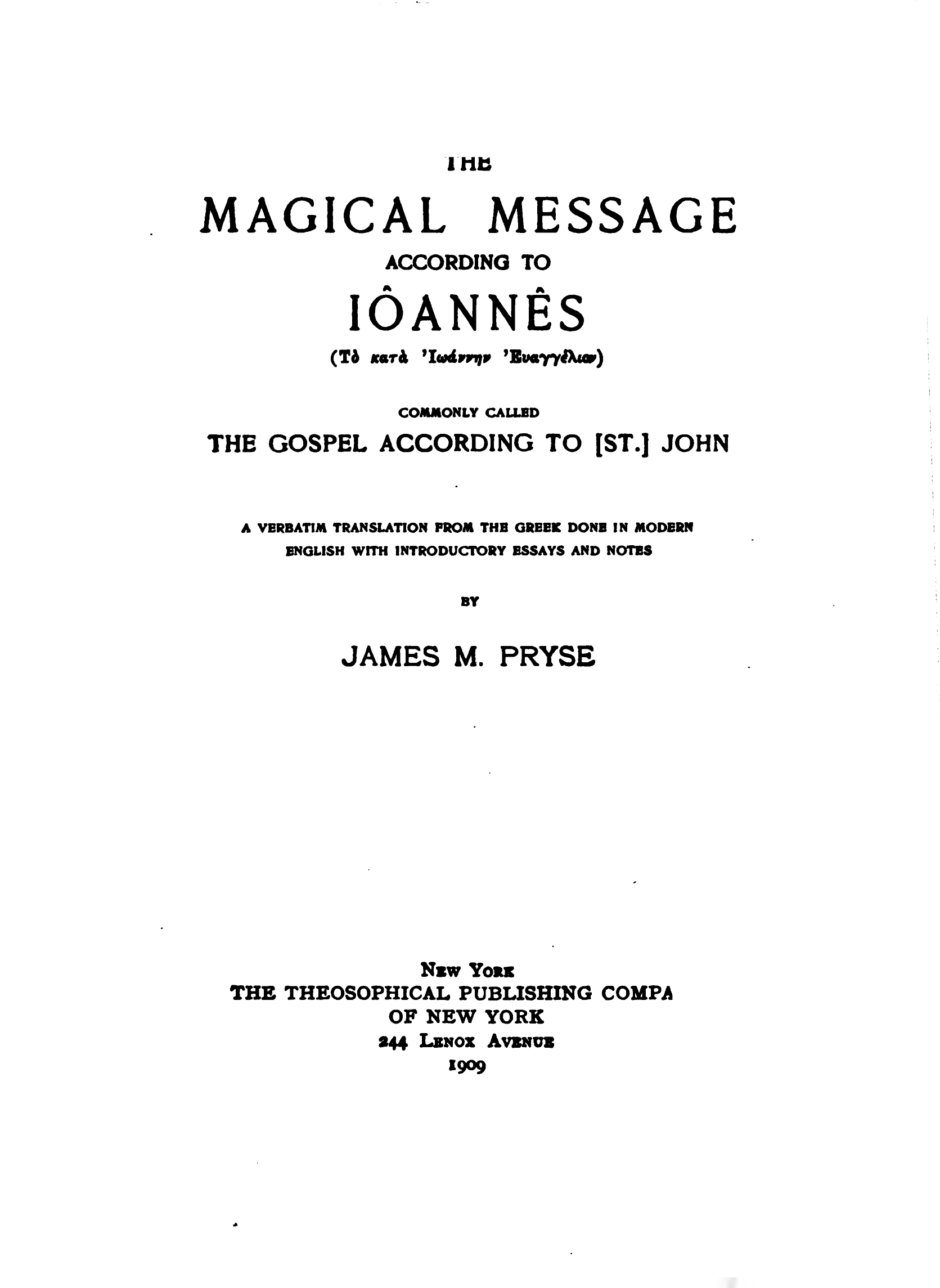 Commonly called The Gospel According to [St.] John; a verbatim translation from the Greek done in modern English with introductory essays and notes.